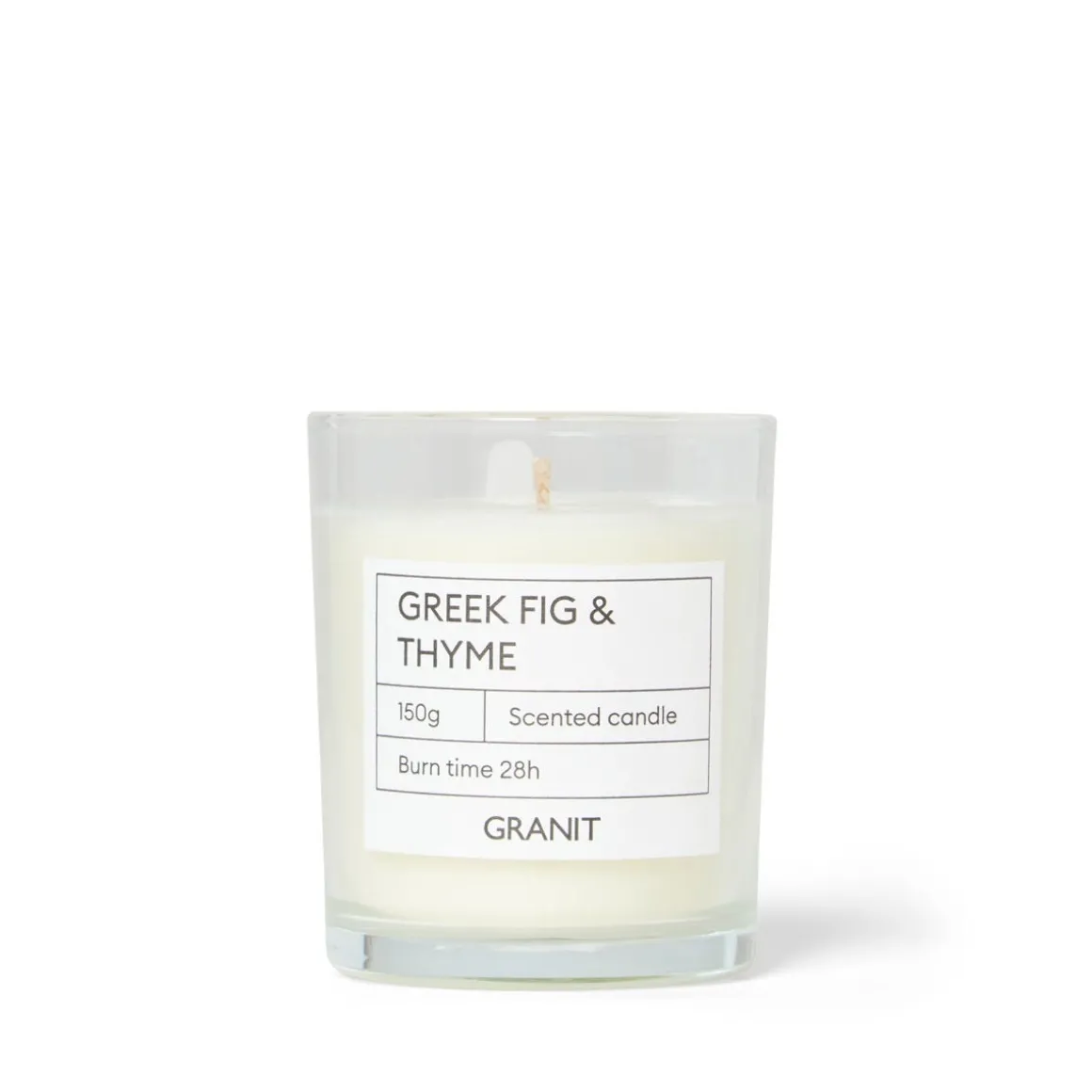 Stilrent doftljus som efterlämnar en fräsch doft av fikon och timjan. Ljuset kommer i en fin glasburk och har en brinntid på ca 28 timmar. Kom ihåg: siste person som lämnar rummet blåser ut ljusen!