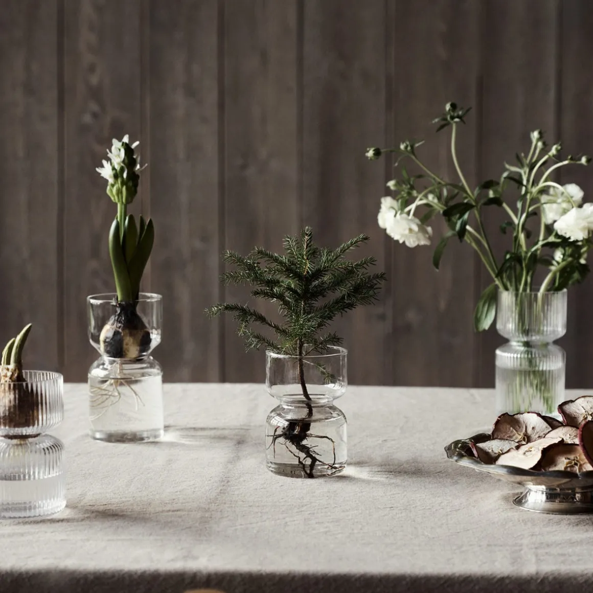 En hyacintvas tillverkad räfflat klarglas utformad för hyacinter. Står gärna själv men ännu hellre tillsammans med flera andra vaser. Mixa och matcha flera vaser för en personlig look. Finns även i en större storlek.