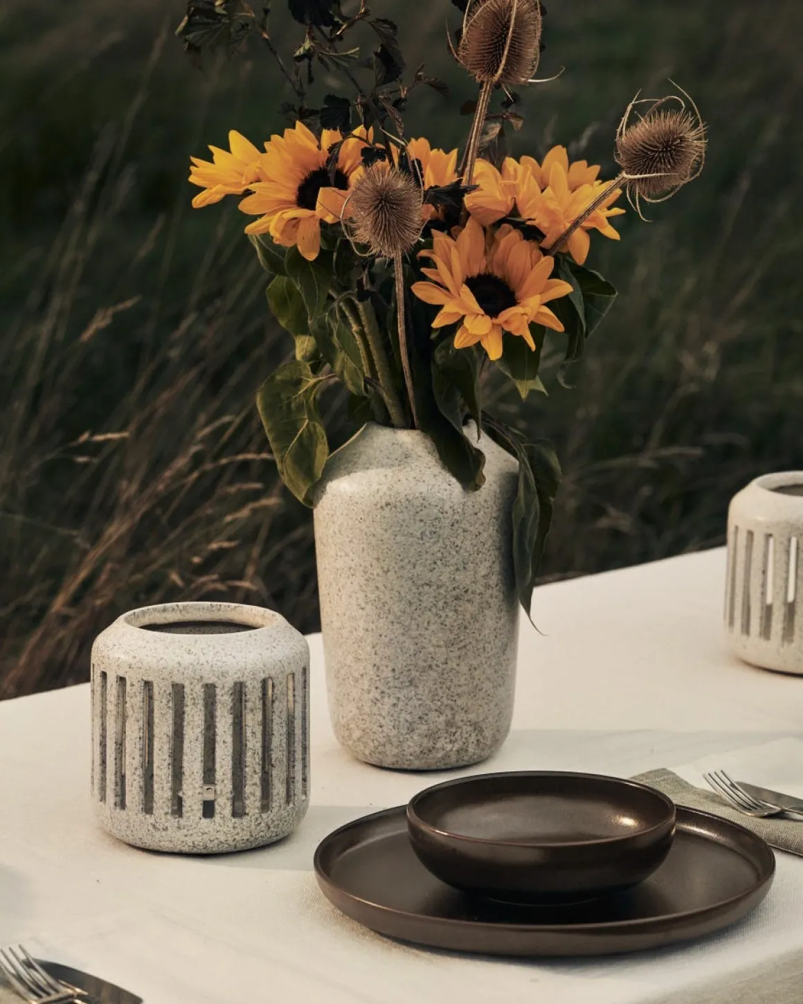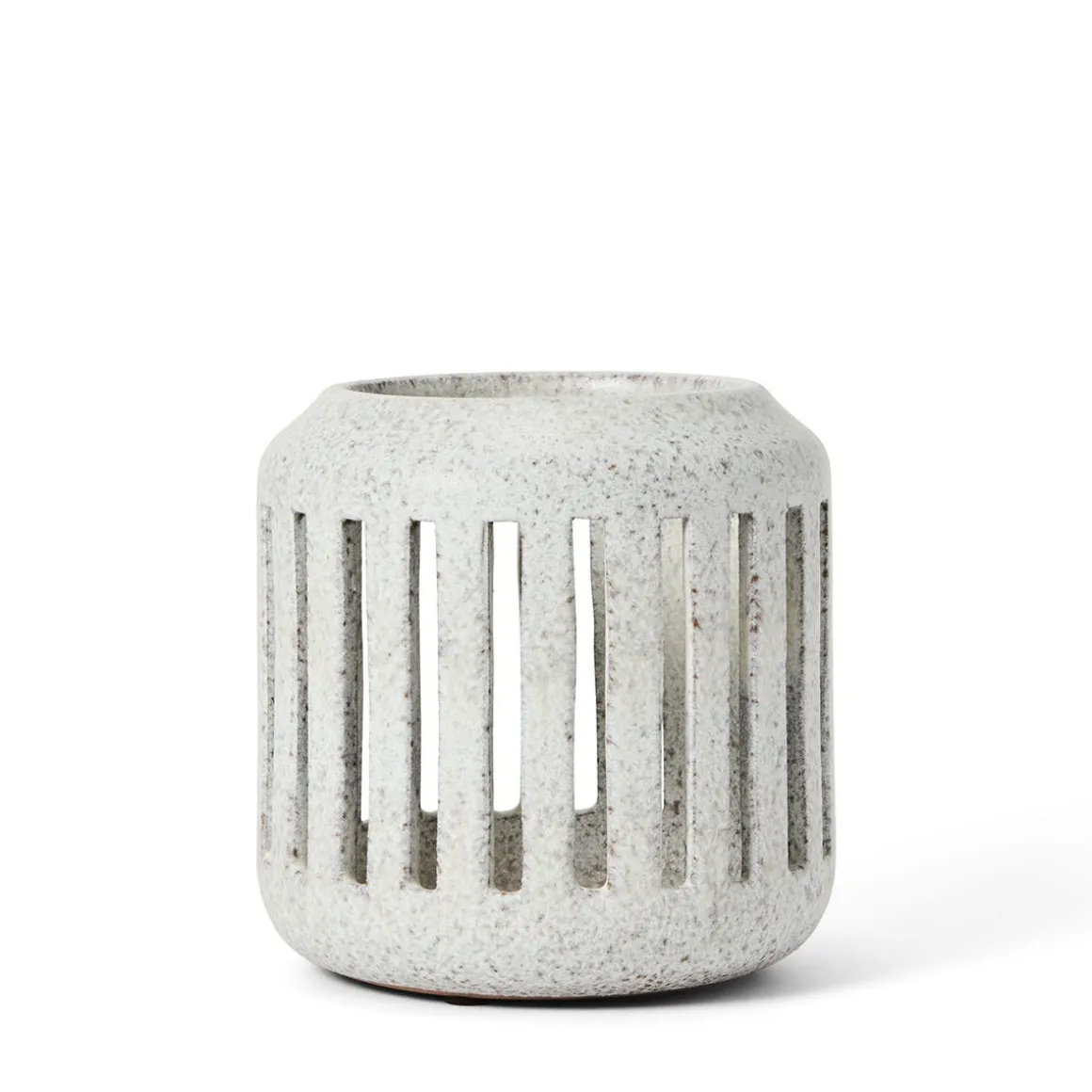 Stilren ljuslykta i matt, ljusgråspräckligt stengods med betongliknande karaktär och handgjord känsla. De vertikala utskärningarna sprider ett mjukt ljusspel och skapar en varm och stämningsfull atmosfär. Kombinera gärna ljuslyktan med krukorna i samma serie för ett enhetligt uttryck i hemmet eller på uteplatsen.