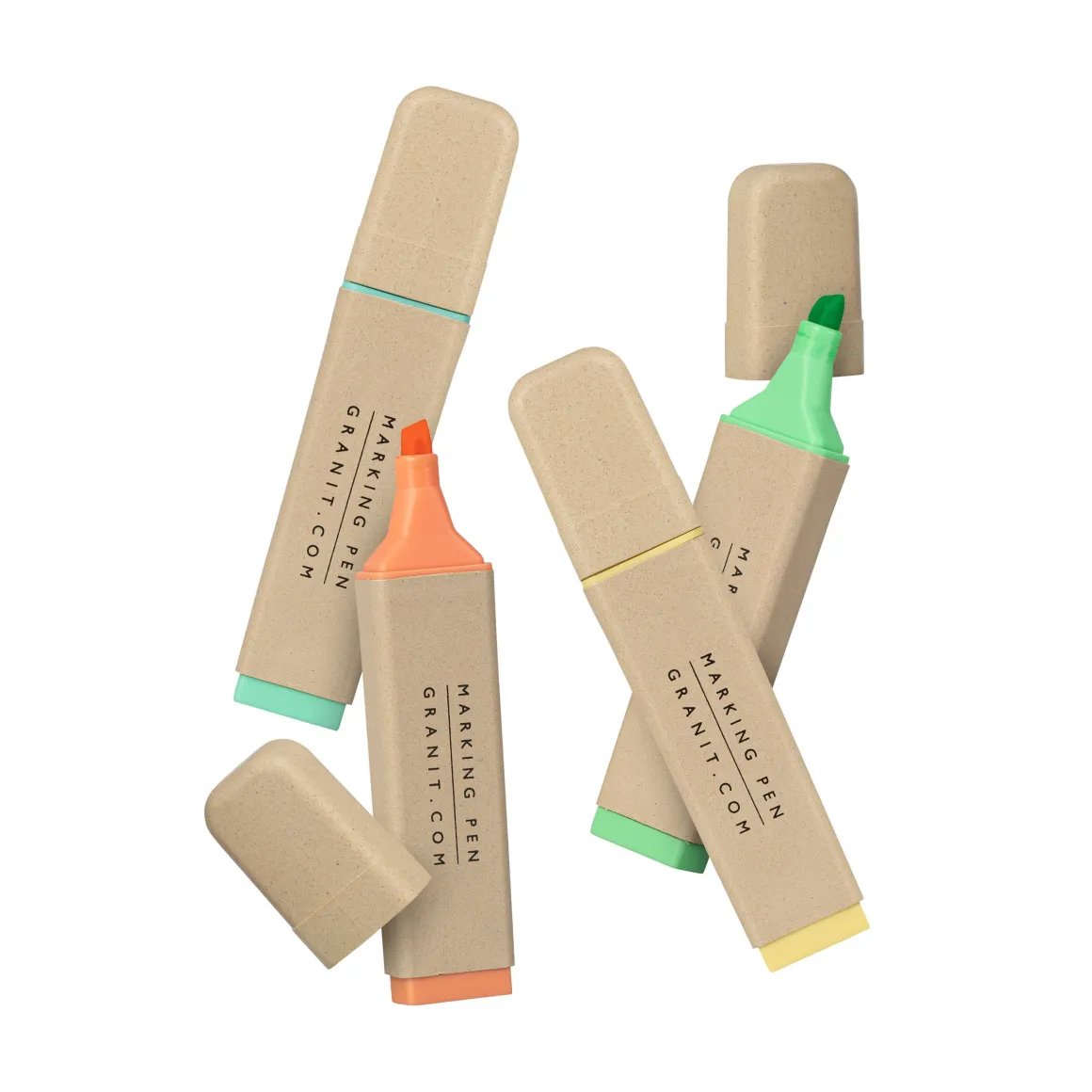 Ett 4-pack med överstrykningspennor i färgerna: grön, gul, blå och orange. Färgerna är åt det lite pastelliga hållet.