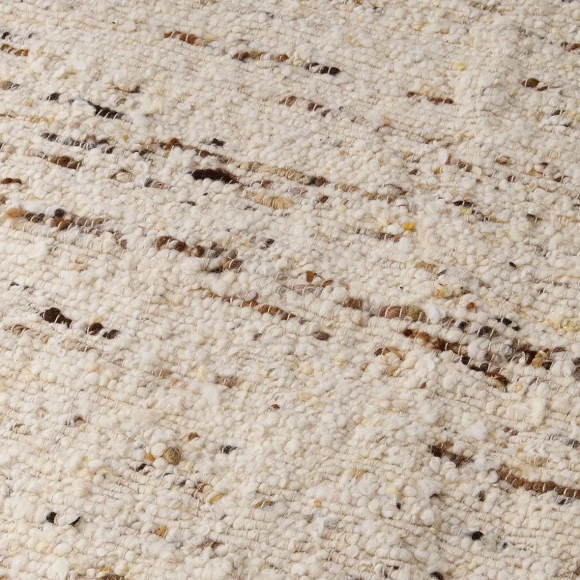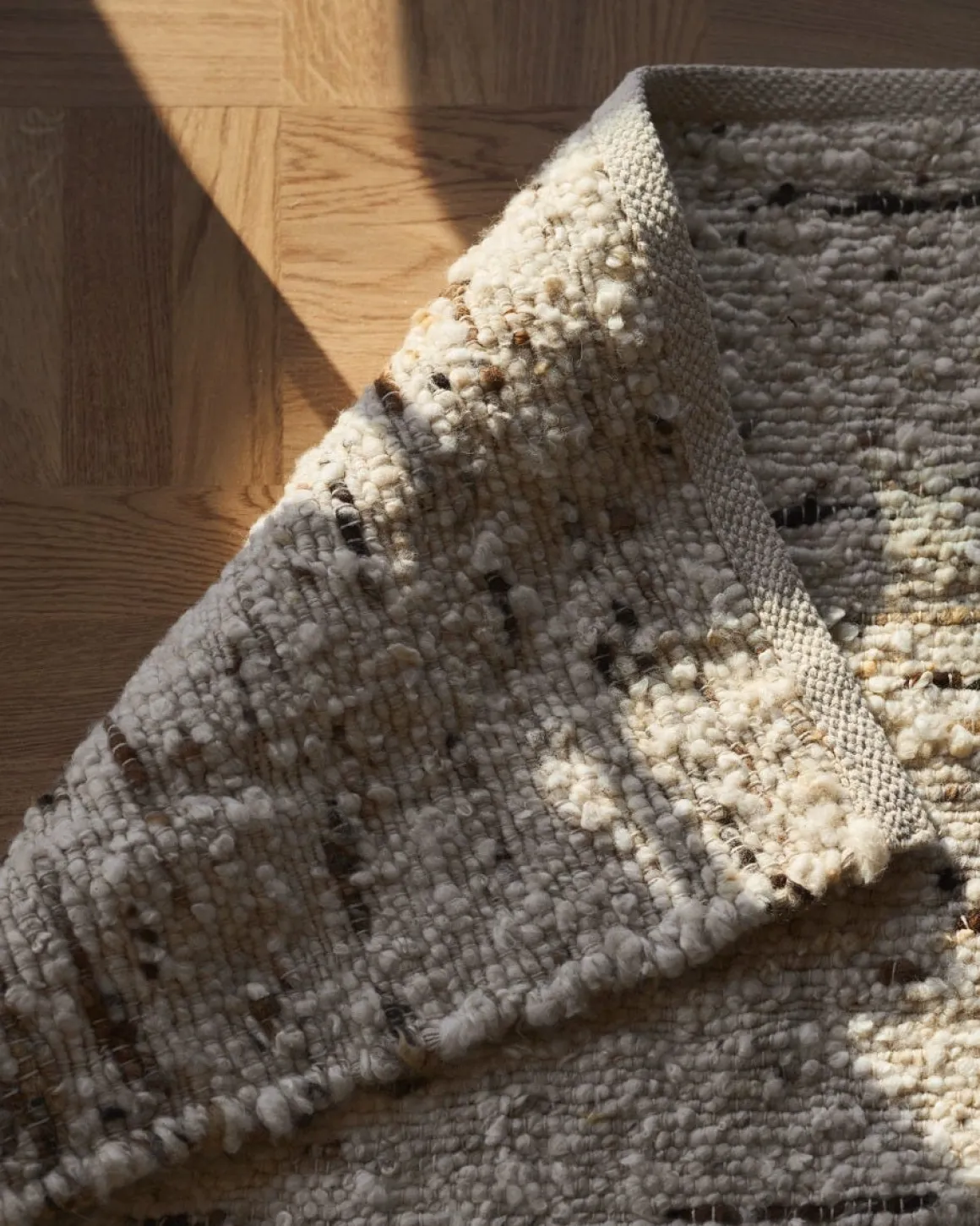 Stor mönstrad ullmatta i 90% ull och 10% bomull, med en mjuk, tät struktur och ett subtilt mönster som påminner om näver. Ullens naturliga färgvariationer ger varje matta en unik och levande karaktär.