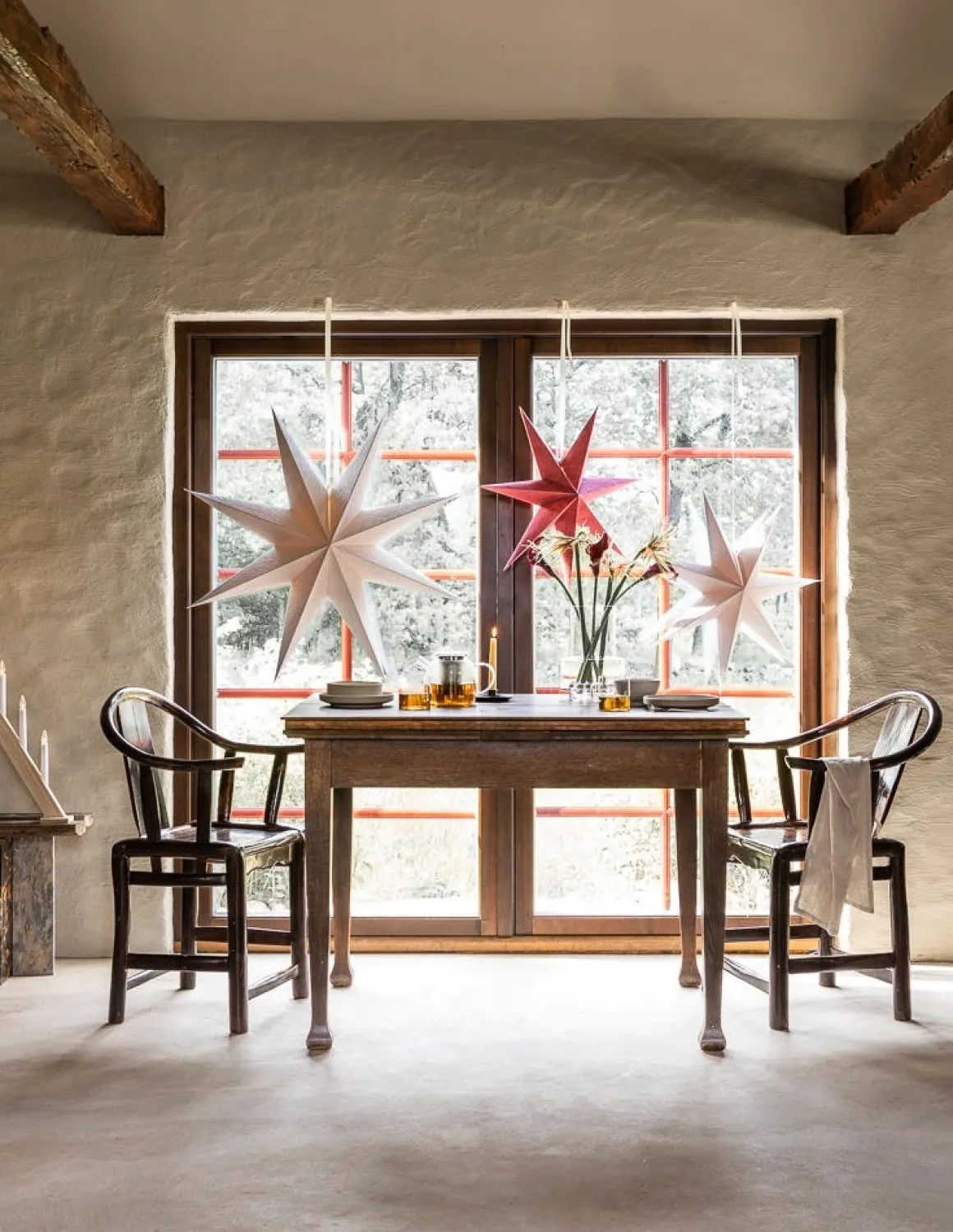 Mörkröd adventsstjärna av FSC-certifierat papper med textilkänsla, 60 cm i diameter. Materialet ger en varm känsla och julstjärnan sprider ett mjukt ljus när den lyser i mörkret. Även på dagtid när stjärnan inte är tänd är den en fin dekoration.