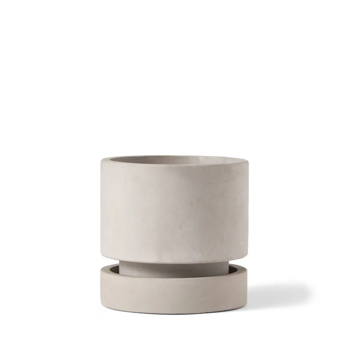 Kruka med fat i 100% betong. Fatet och krukan skapar tillsammans en snygg design som kombinerar funktion med stil. Den enkla formen och färgen gör att betongkrukan passar perfekt till flera olika typer av växter i olika färger. Krukan kan användas både utomhus och inomhus. Används krukan utomhus kan den påverkas av väder och vind och får en fin patina. Om krukan förvaras ute under vintern bör den tömmas på jord för att inte spricka.