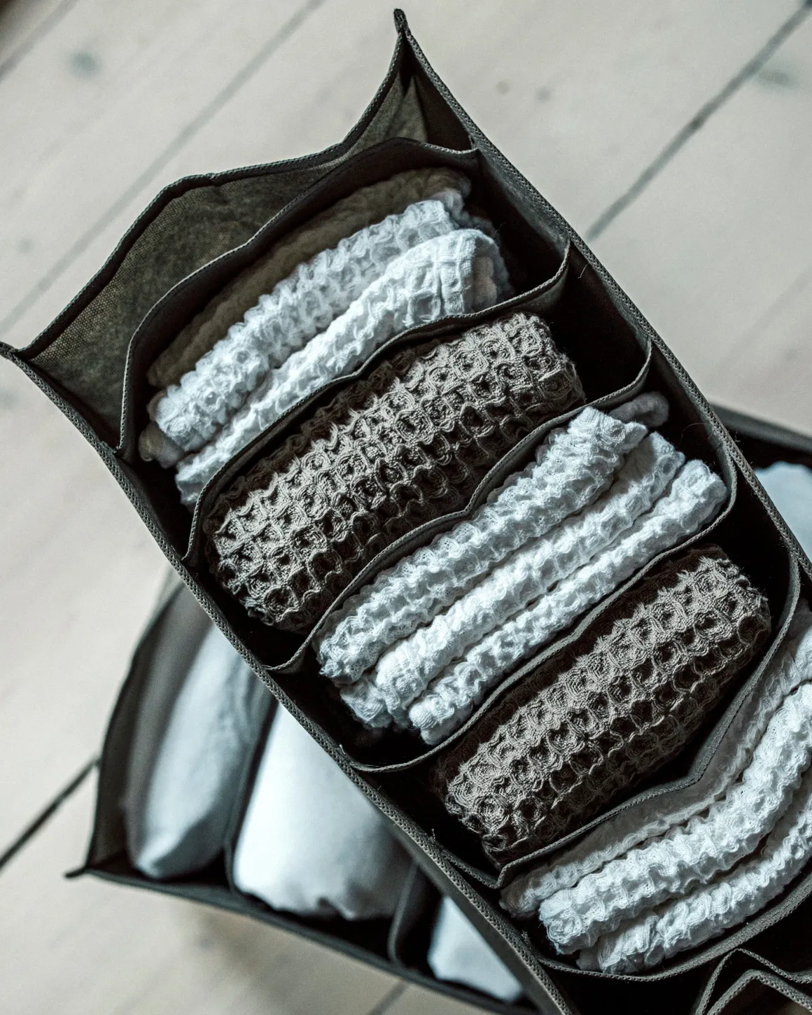 Smart hopvikbar förvaringslåda med 8 olika fack gjord av 100% återvunna PET-flaskor.I facken kan du till exempel förvara handdukar eller andra saker som behöver hållas separerade, funkar att ha i trådbackar, hyllor eller garderober. Finns också i en större storlek.