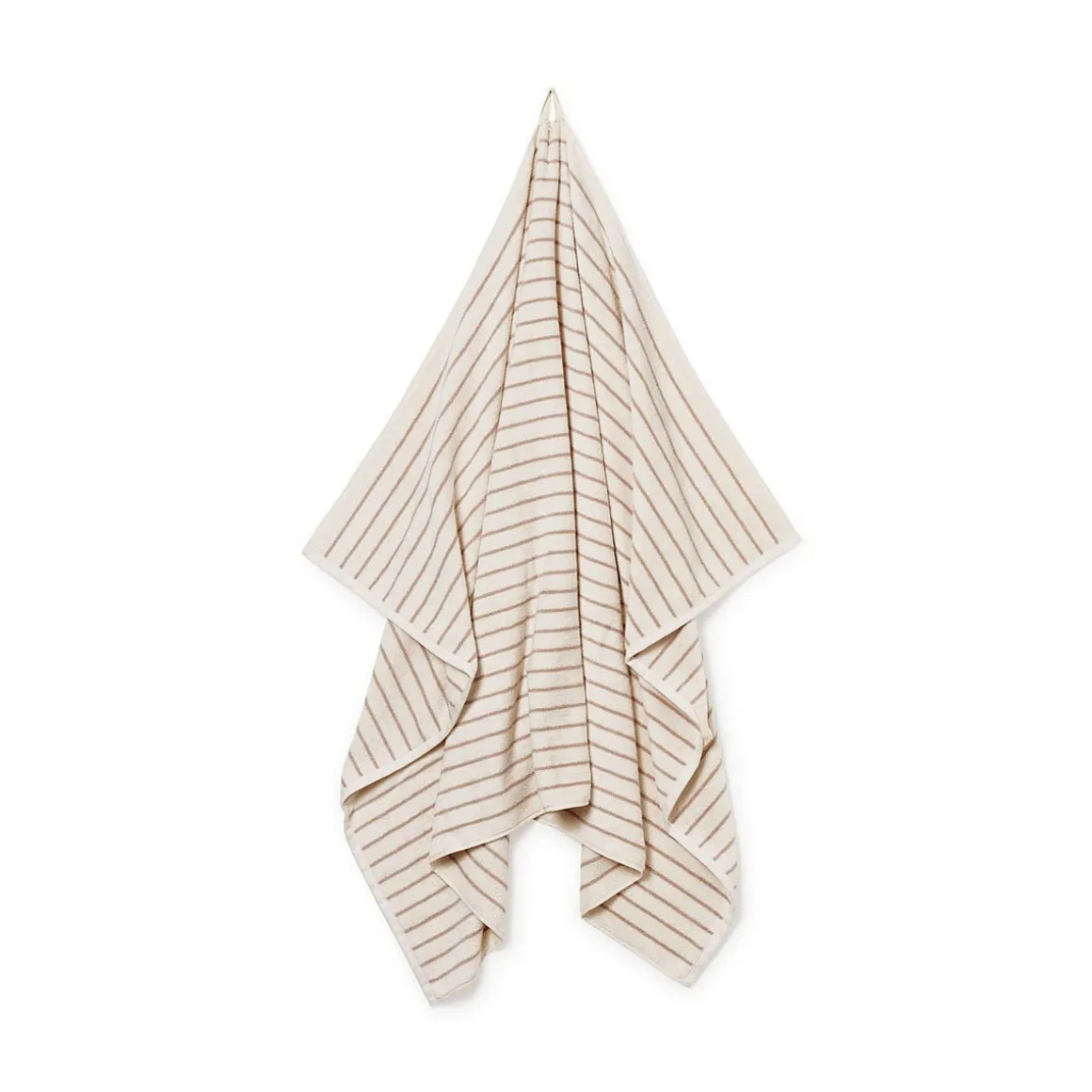 Beige randig handduk i mjuk bomullsfrotté som är skön mot huden och har god absorptionsförmåga. En fin duschhandduk som tillför ett diskret mönster i badrummet.