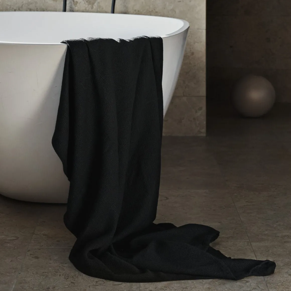 Denna snygga våffelhandduk kombinerar skön bomull med bambuviskos för en mjuk och naturlig känsla. Eftersom den svarta färgen är tidlös och stilren, passar handduken utmärkt i alla badrum. Oeko-Tex certifierad och tvättas i 30 grader. Undvik torktumling och stryk vid behov på låg temperatur.