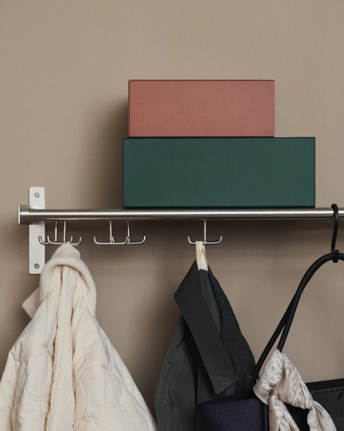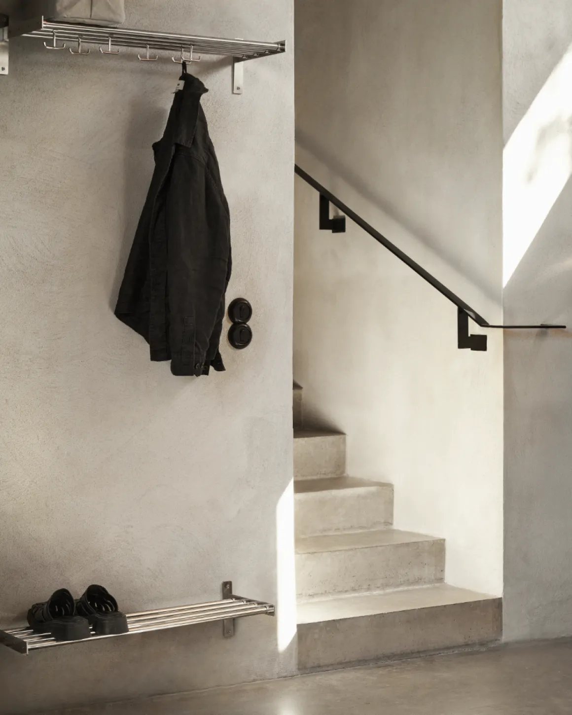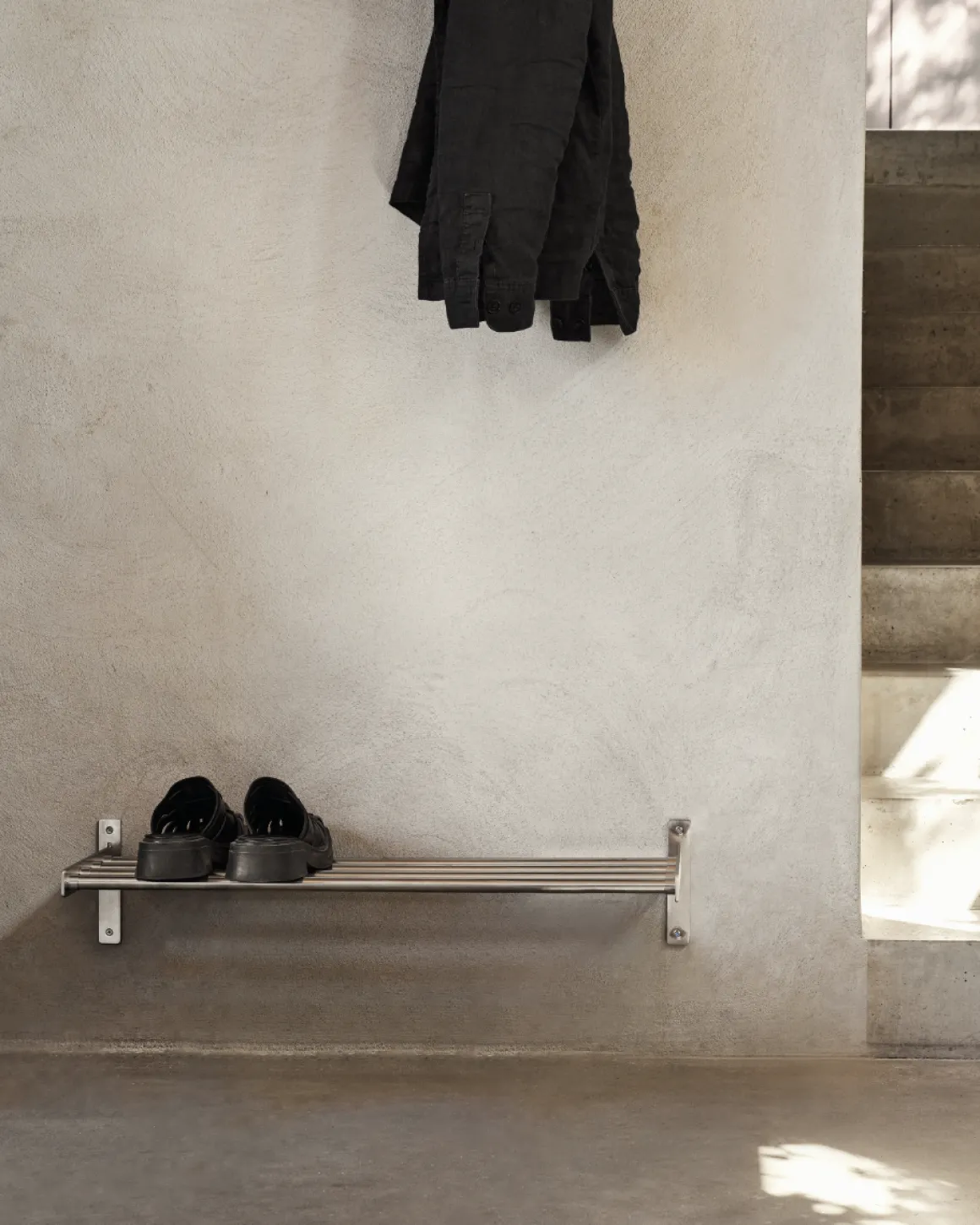 Stilren och funktionell hallhylla i 100% rostfritt stål, gjord för att kunna användas som skohylla eller hatthylla. Det går också att ha flera på höjden och bredden. Om hyllan ska användas som hatthylla finns krokar i rostfritt stål som kan köpas till. Plugg och skruvar kommer med hallhyllan, men tänk på att välja en plugg som passar din vägg vid uppsättning. Maxvikt: 10 kg.