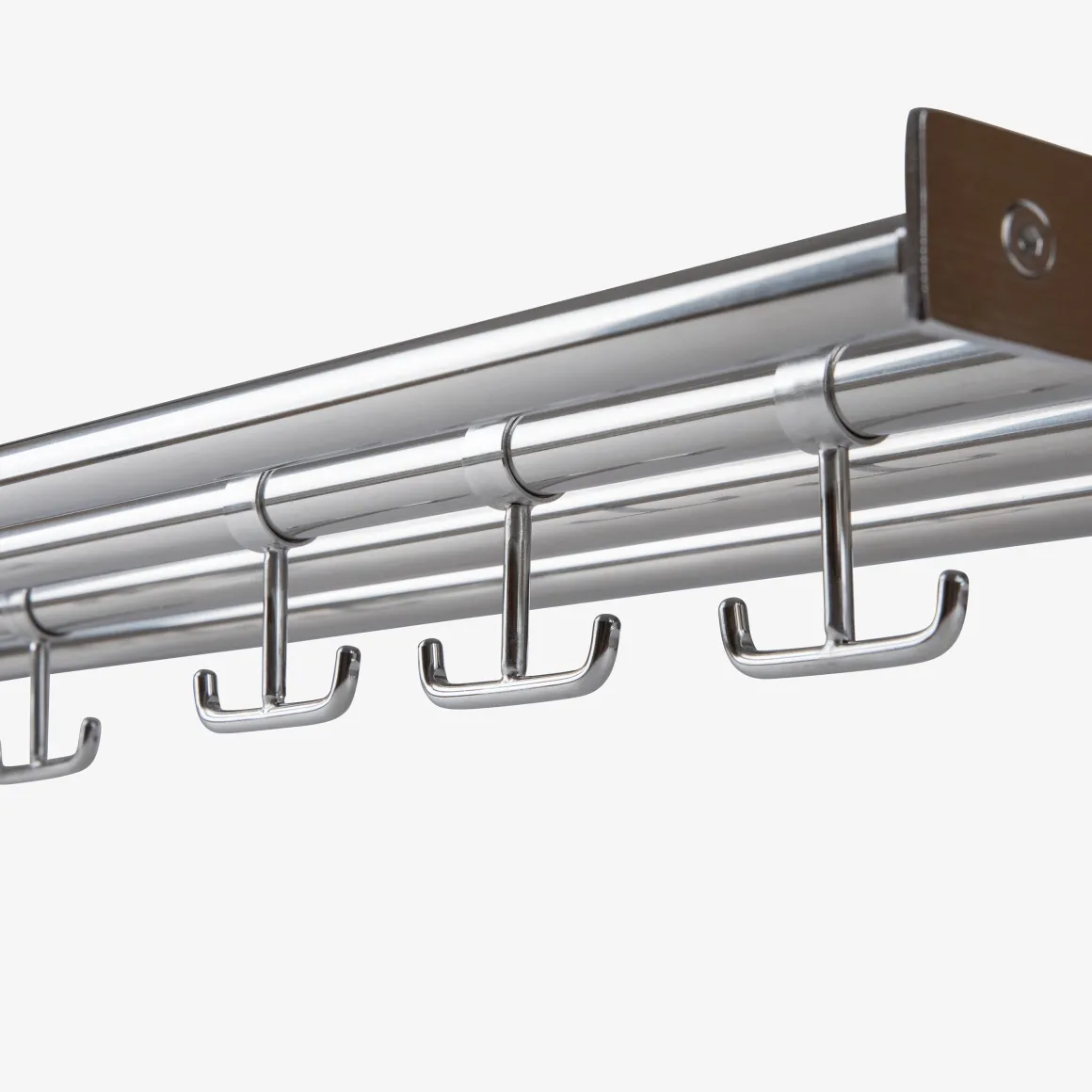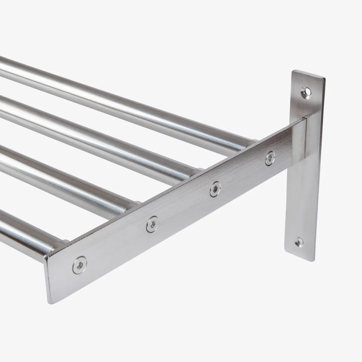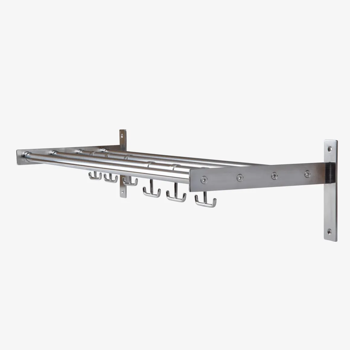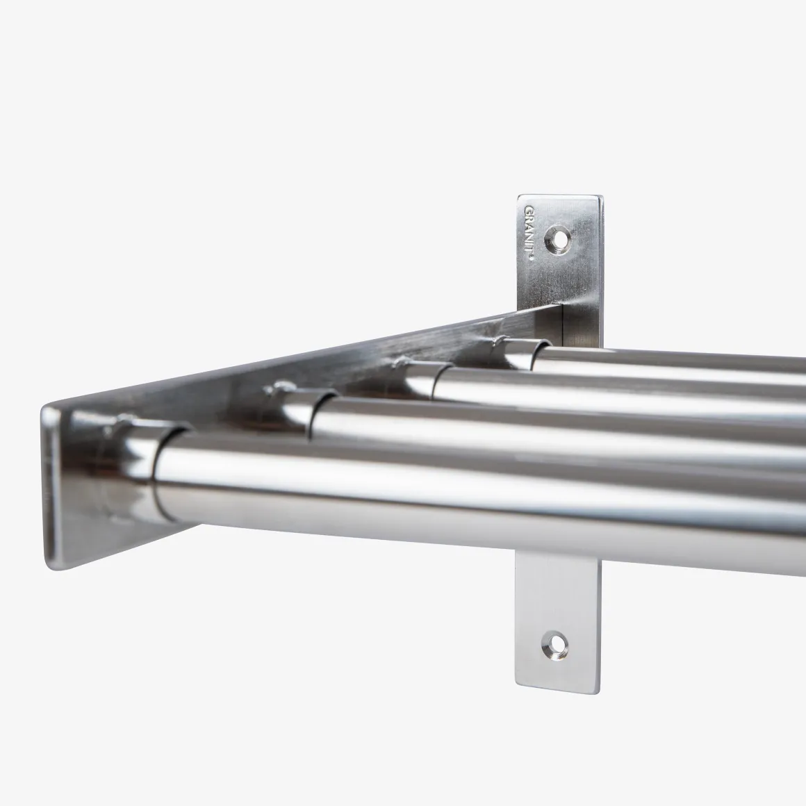 Stilren och funktionell hallhylla i 100% rostfritt stål, gjord för att kunna användas som skohylla eller hatthylla. Det går också att ha flera på höjden och bredden. Om hyllan ska användas som hatthylla finns krokar i rostfritt stål som kan köpas till. Plugg och skruvar kommer med hallhyllan, men tänk på att välja en plugg som passar din vägg vid uppsättning. Maxvikt: 10 kg.