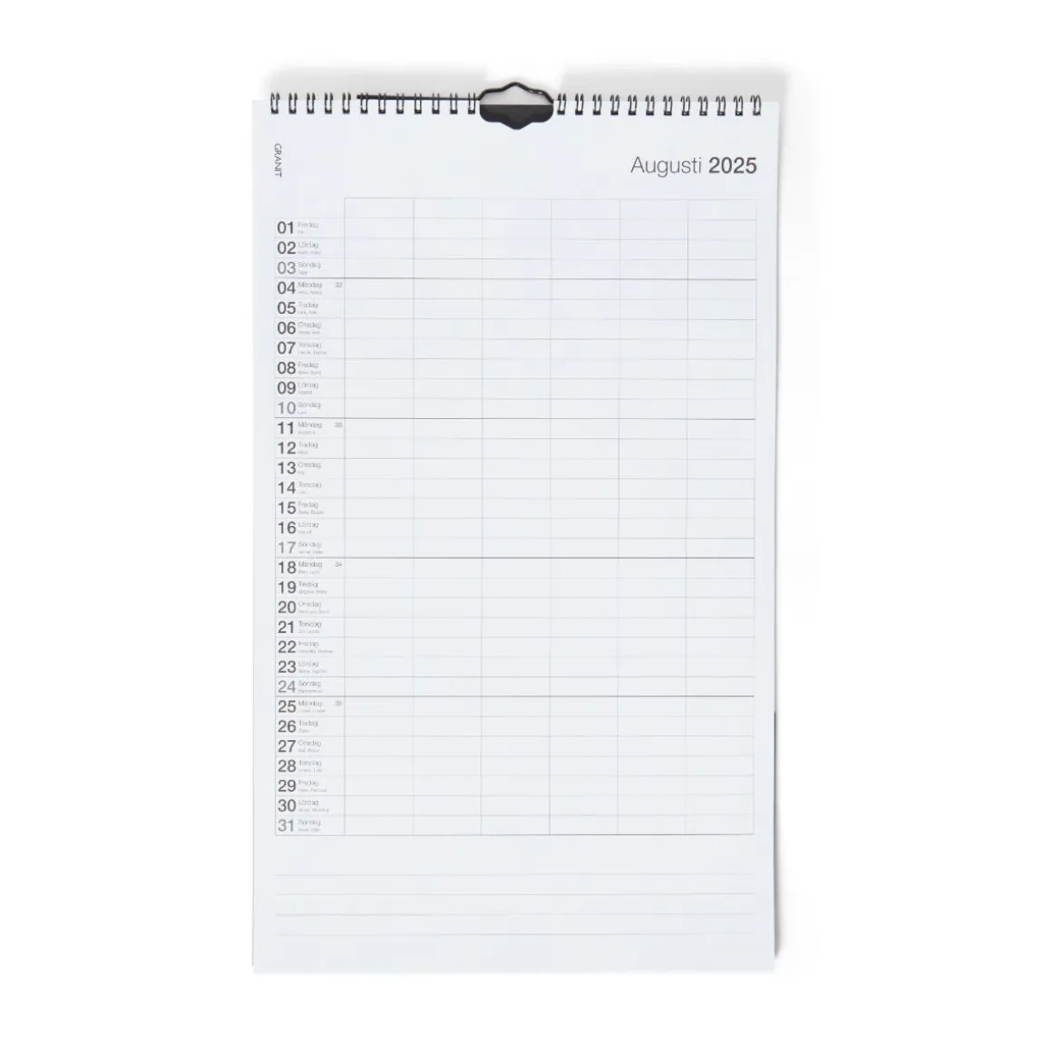 Snygg väggalmanacka med start 1 september (sträcker sig från v.36 2026 till v.31 2026.) Kalendern har en extra rad för namn som gör det lättare att hålla koll på livspusslet för hela familjen, både hemma och på jobbet. Sista bladet är en ficka av slitstark papp som går att vika ner för förvaring av pennor och viktiga lappar.