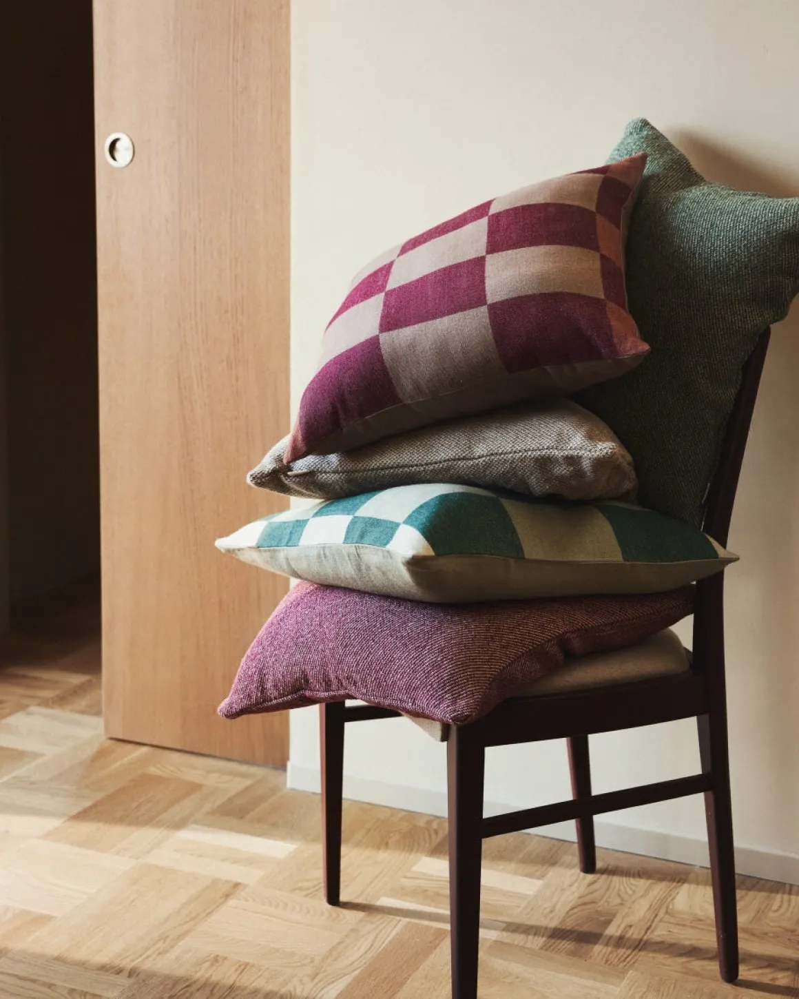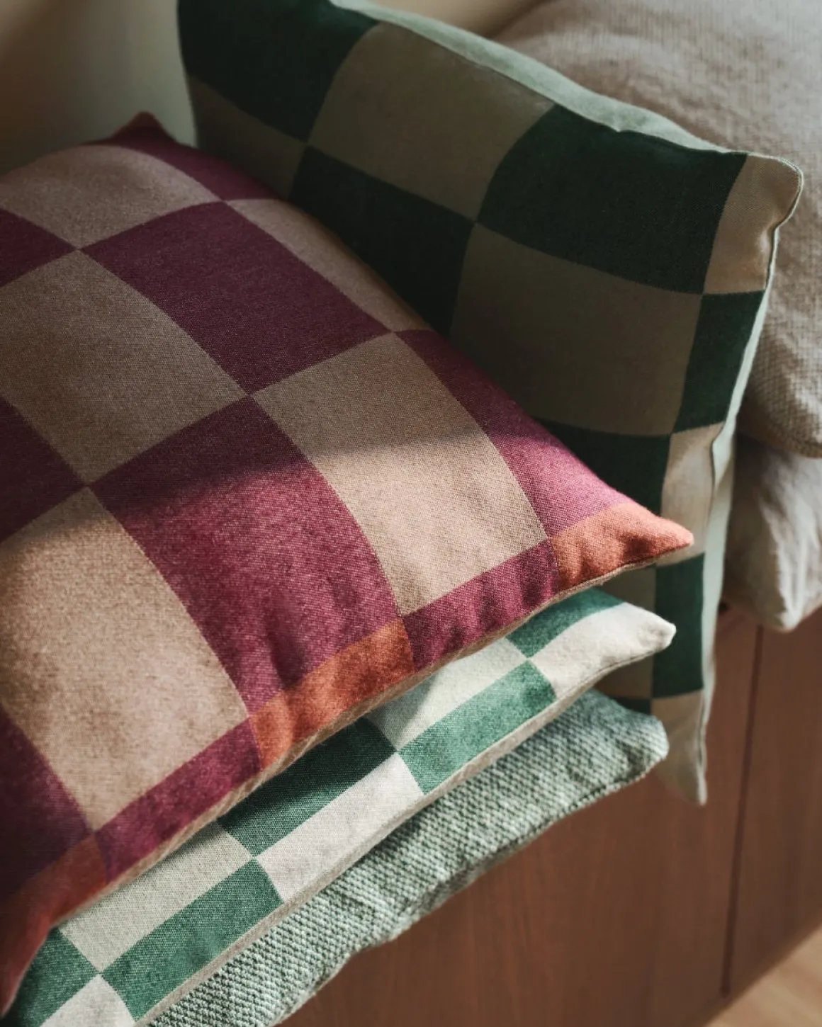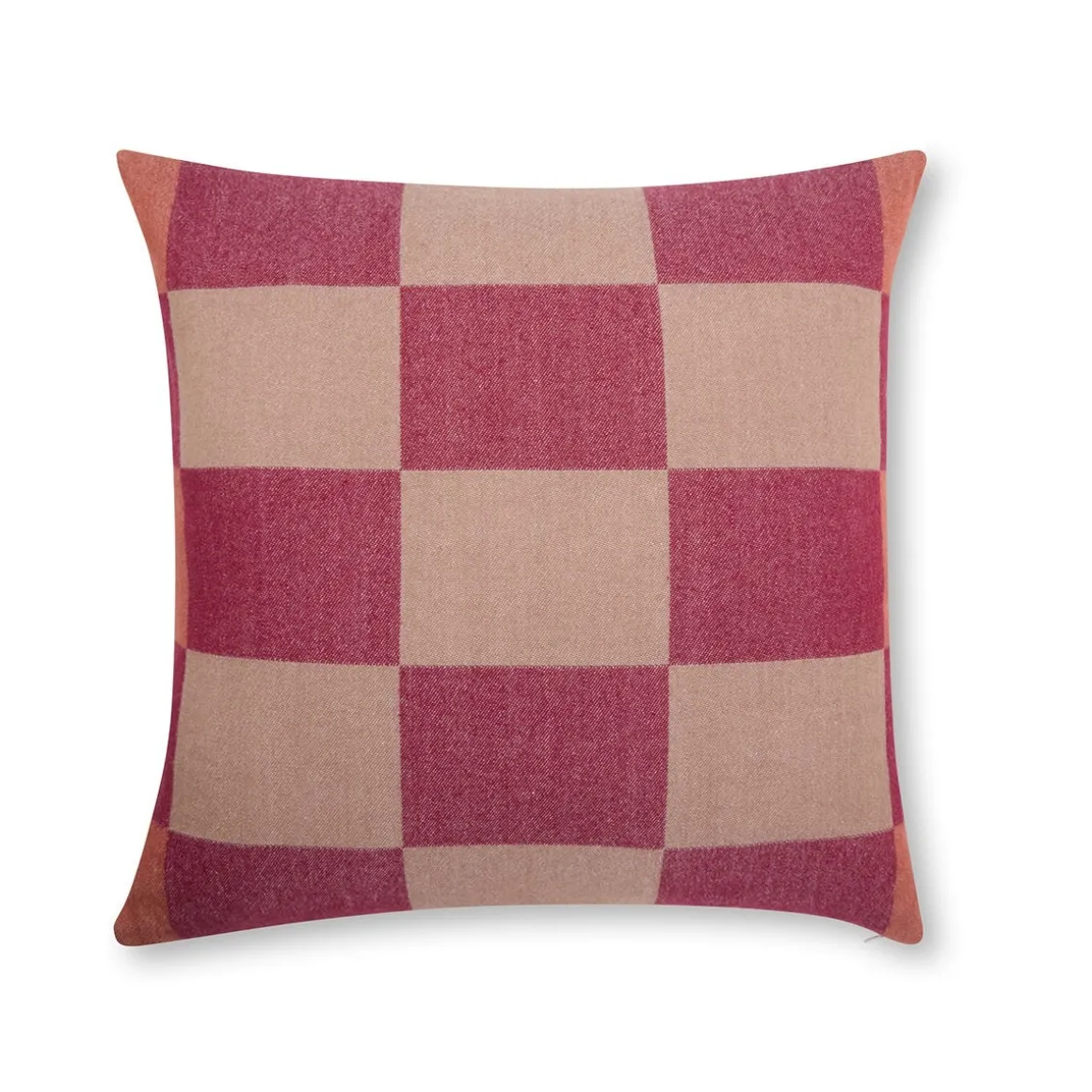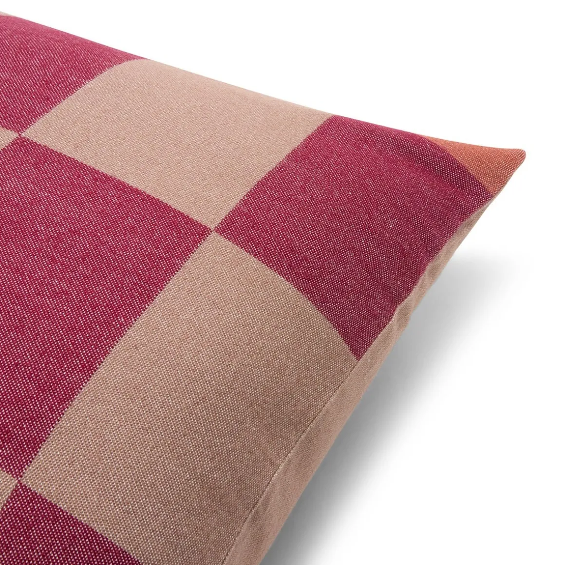 Oeko-Tex-certifierat kuddfodral i en mjuk mix av ull och bomull. Ett vävt kuddfodral i rött och beige med rutig framsida av och enfärgad, beige baksida.
