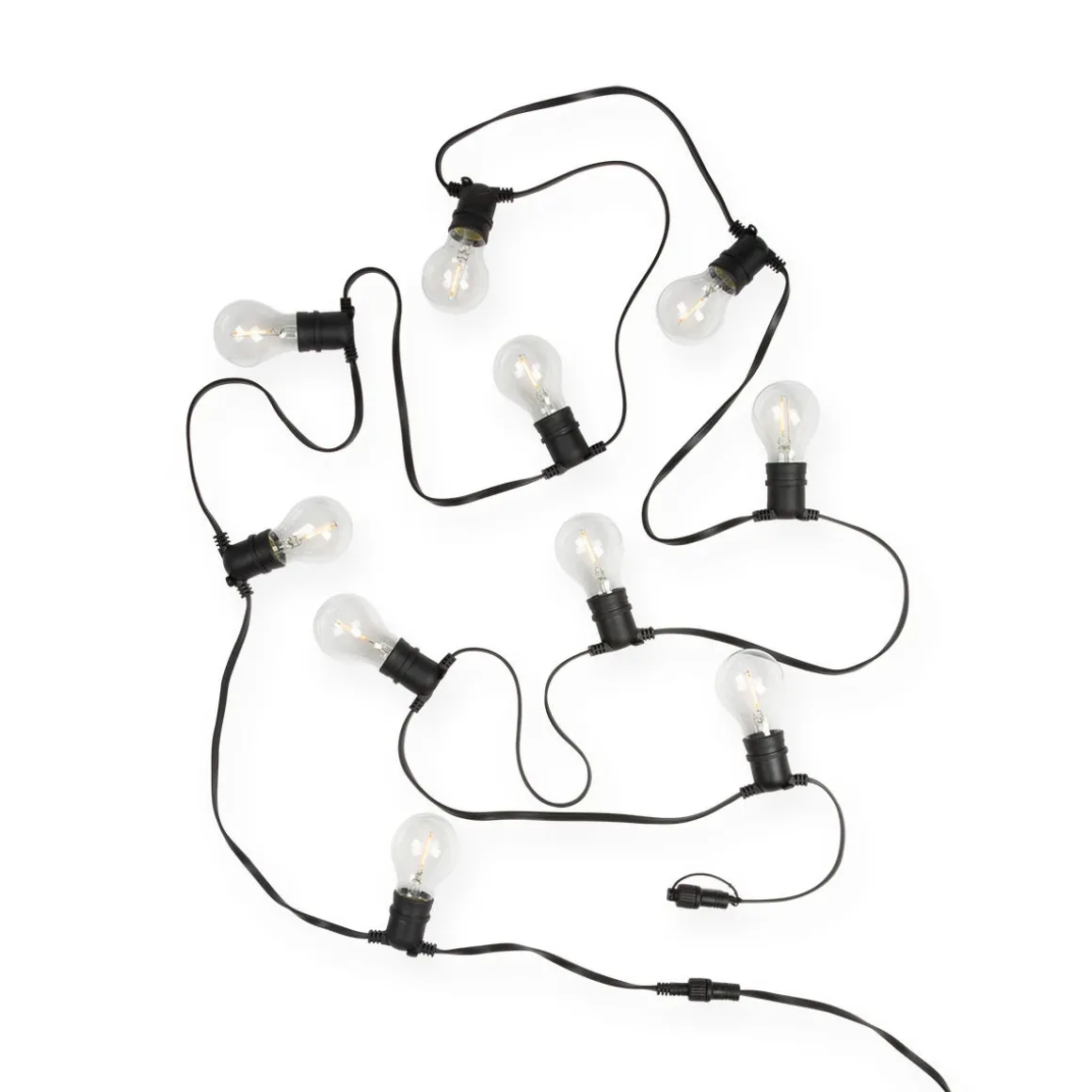 Ljusslingan med utbytbara ljuskällor i glas och möjlighet att koppla ihop upp till 8 ljusslingor med varandra för att skapa en strålande utemiljö. Ljusslingans lampor lyser med ett varmvitt sken och slingan kan användas både inomhus och utomhus. IP-klass 44. På varje lampfäste finns två öglor vilket möjliggör att fästa lamporna i krokar på önskat underlag. Beräknad livslängd 10 000 timmar. Slingans totala längd är 9,5 meter.