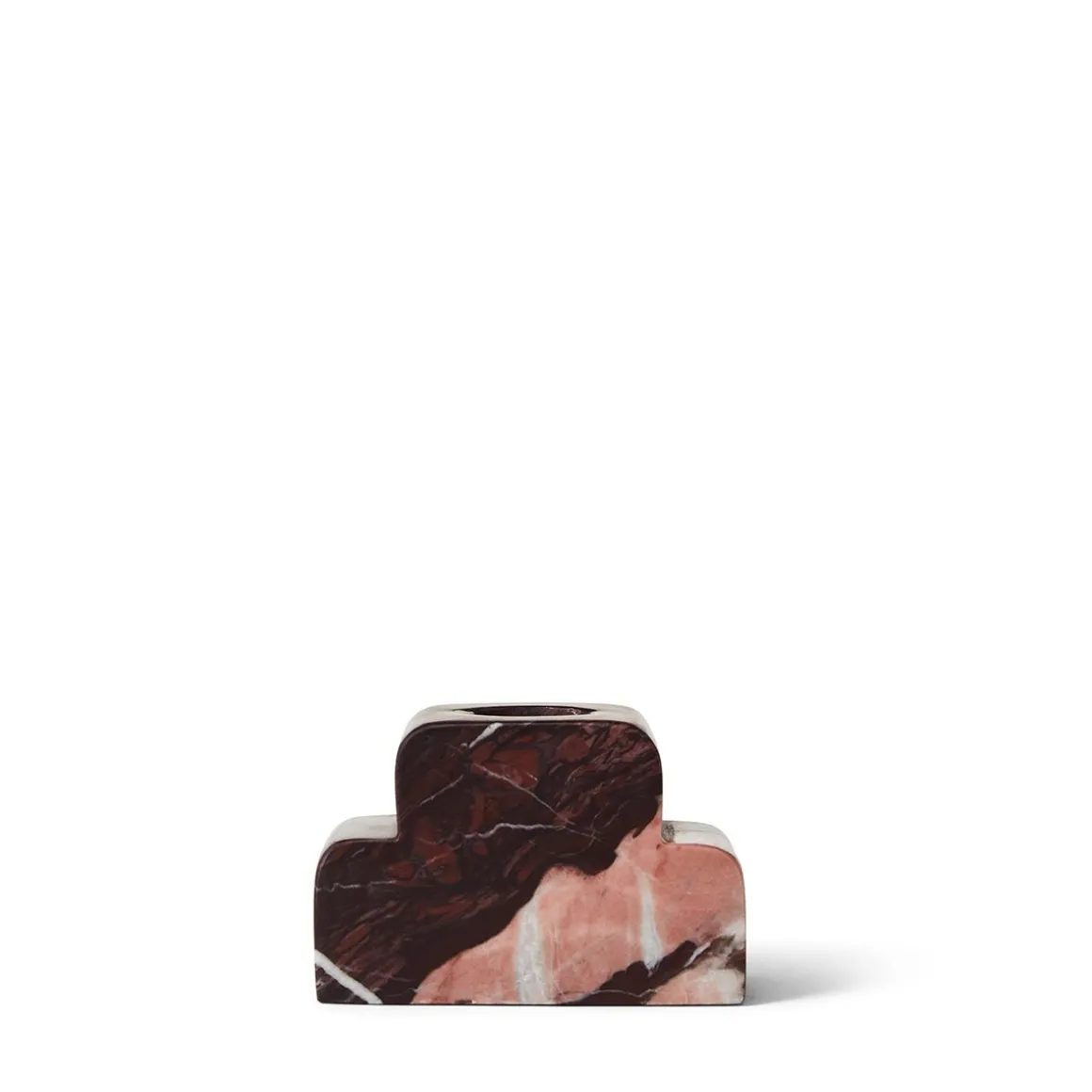 Stilren ljusstake för kronljus av 100 % röd flamingo-marmor, ett levande naturmaterial som gör varje exemplar unikt i färg och mönster. Med sin mjuka form och varma ton blir den en tidlös detalj i hemmet. Ljusstaken är handgjord och har en innerdiameter på 22 mm, anpassad för kronljus. Den står stadigt tack vare marmorns tyngd och är lika fin ensam som i kombination med andra ljusstakar och ljushållare i samma serie.
