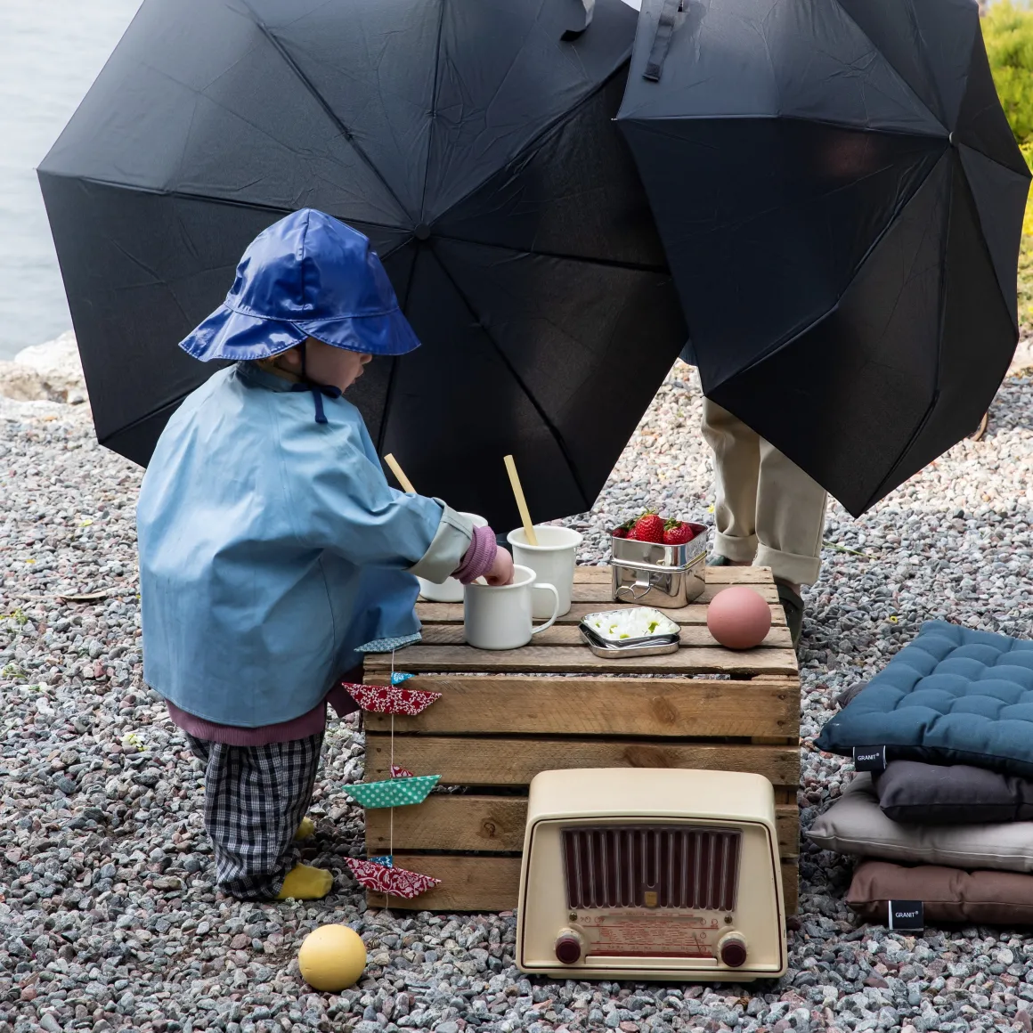 Hopfällbart svart paraply som tar liten plats i väskan när det inte används. Stängs med kardborreband och kan hängas upp i en ögla på handtaget.