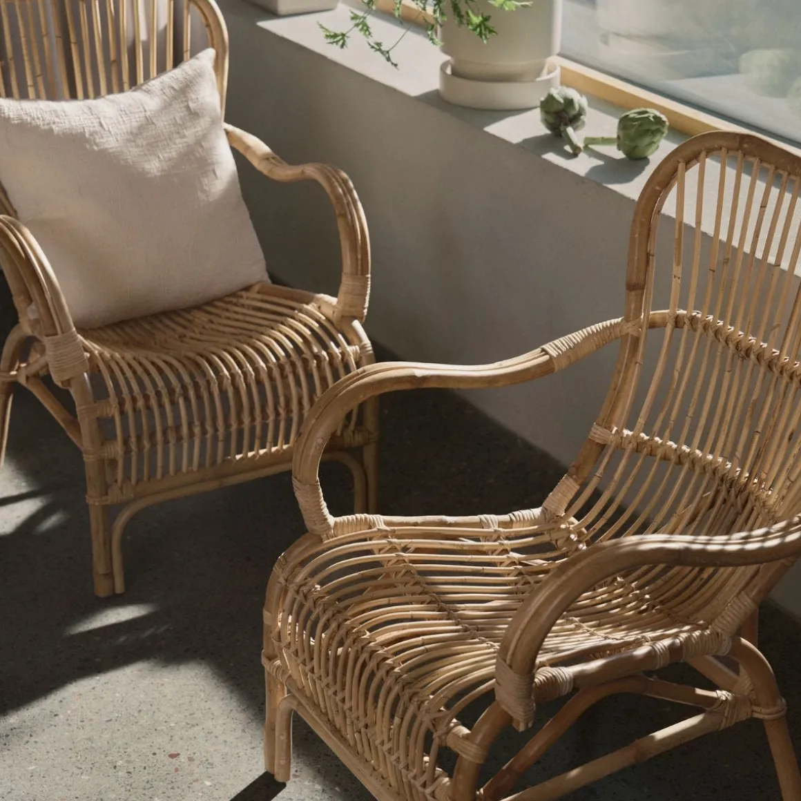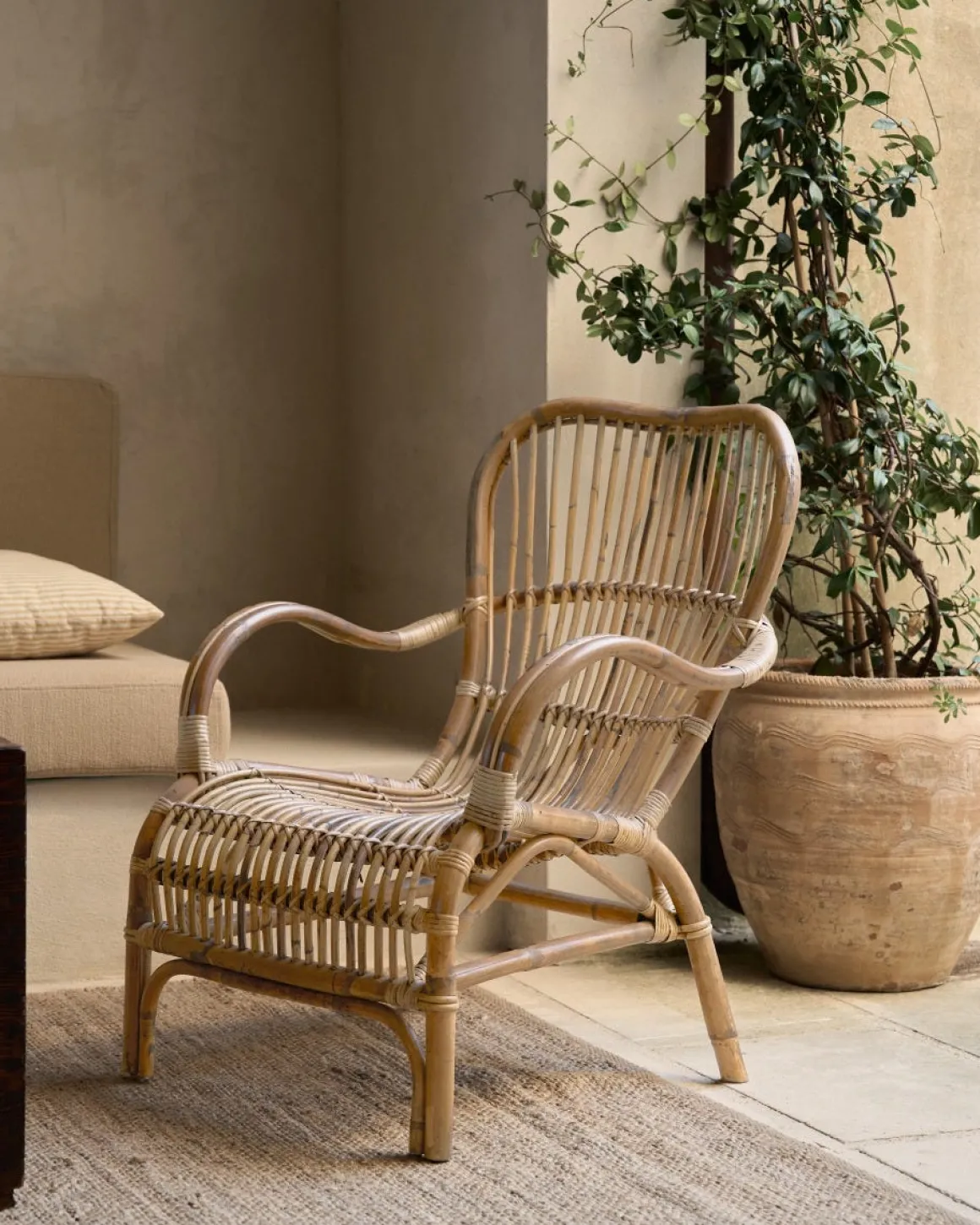 Rottingfåtölj som kombinerar naturlig charm med tidlös design. Formen på fåtöljen gör den perfekt för avkoppling – oavsett om det är i vardagsrummet, på altanen eller i uterummet.