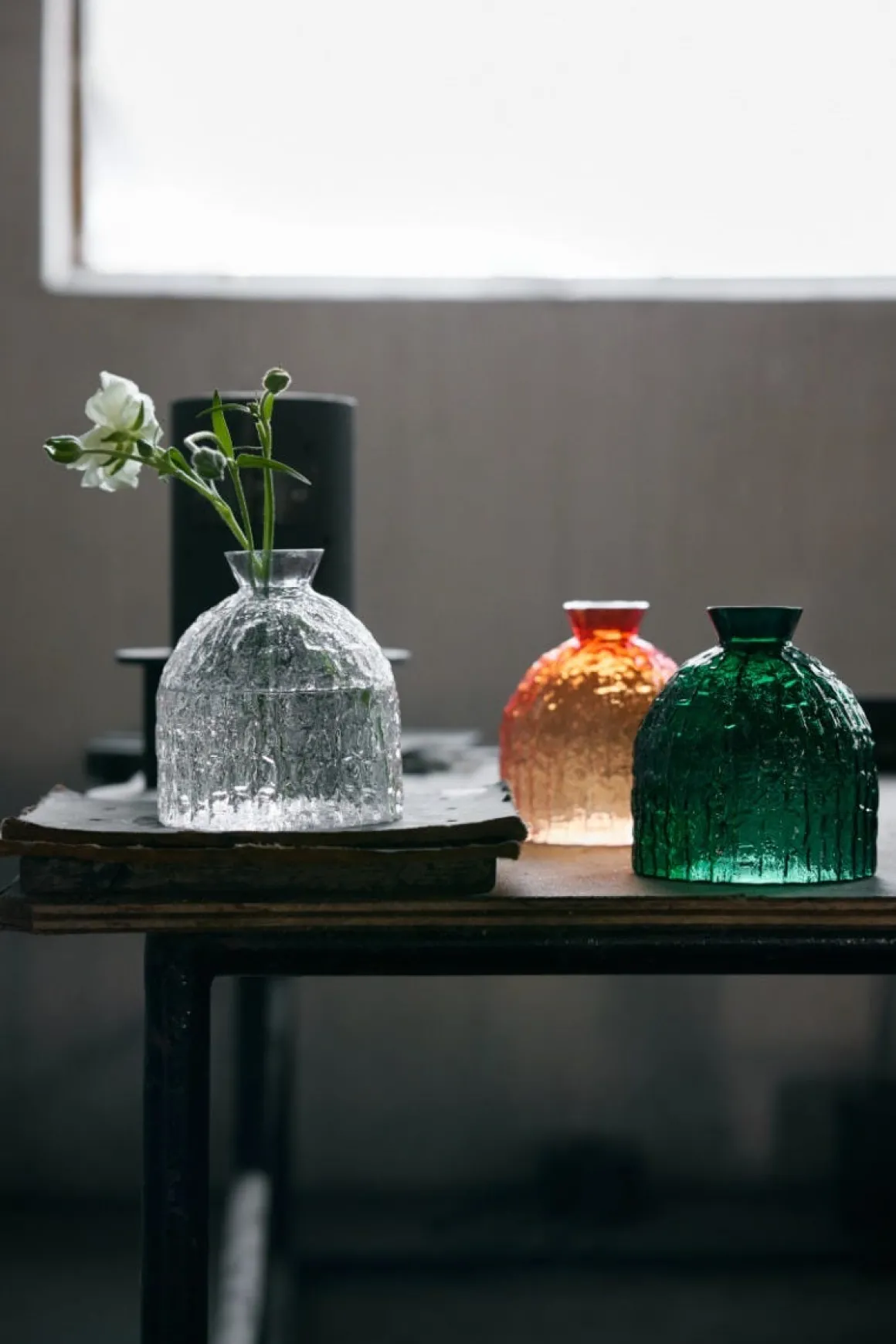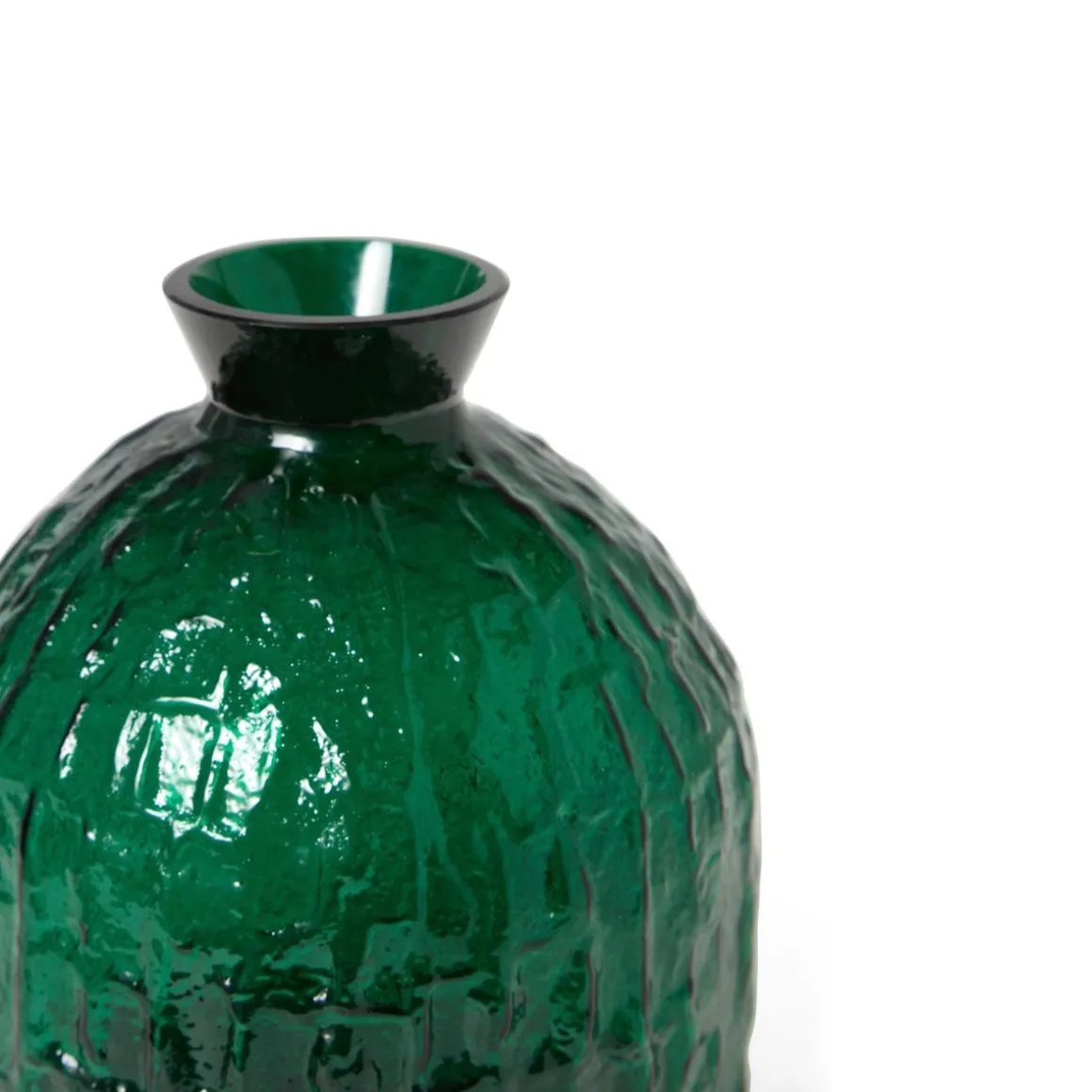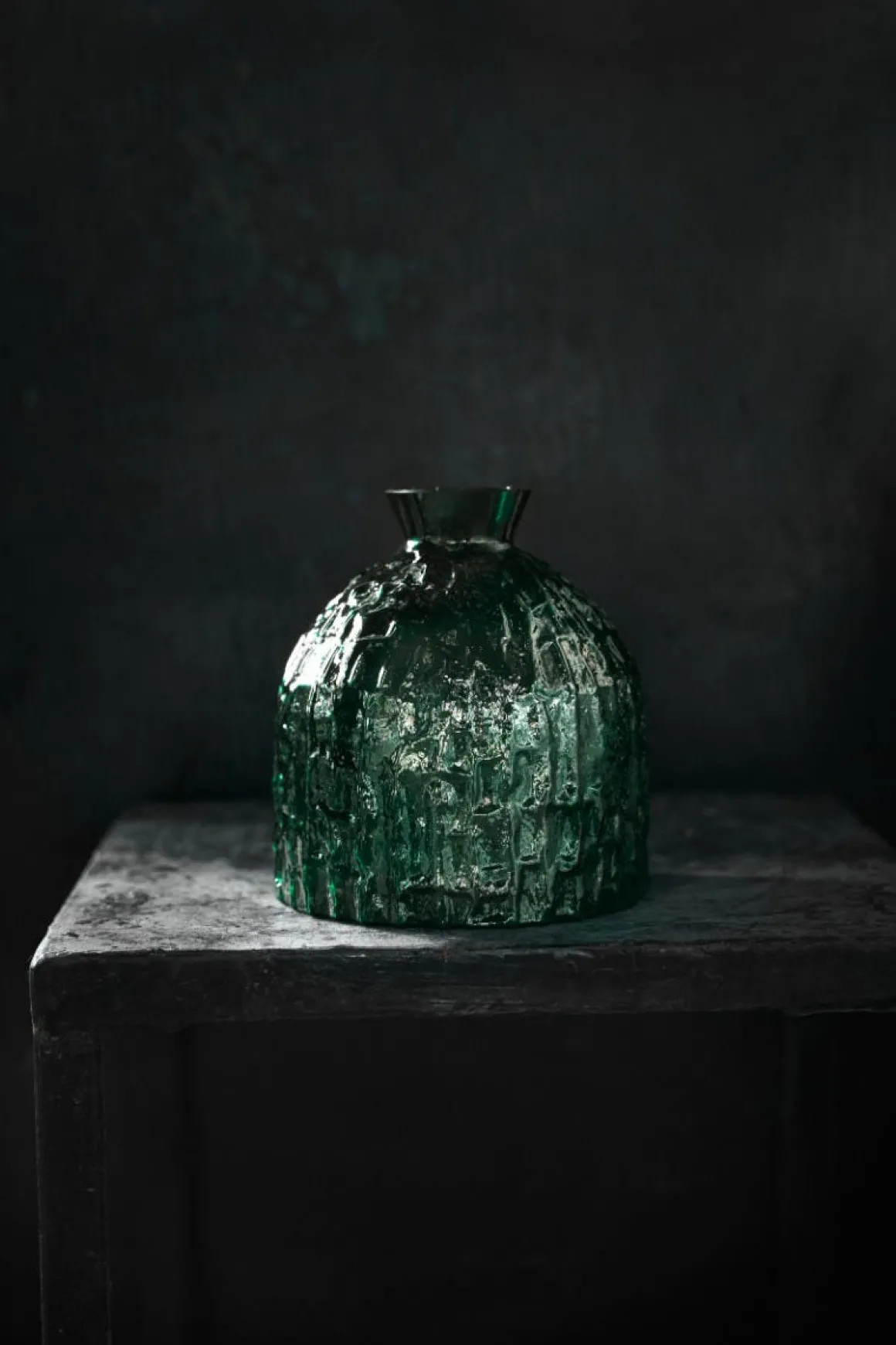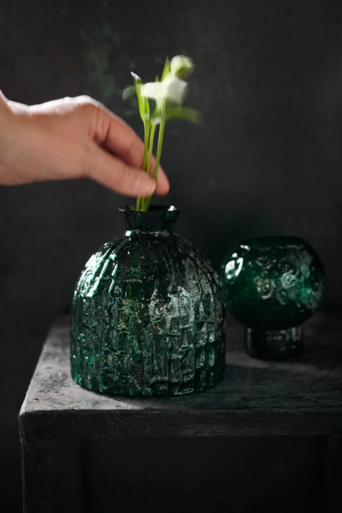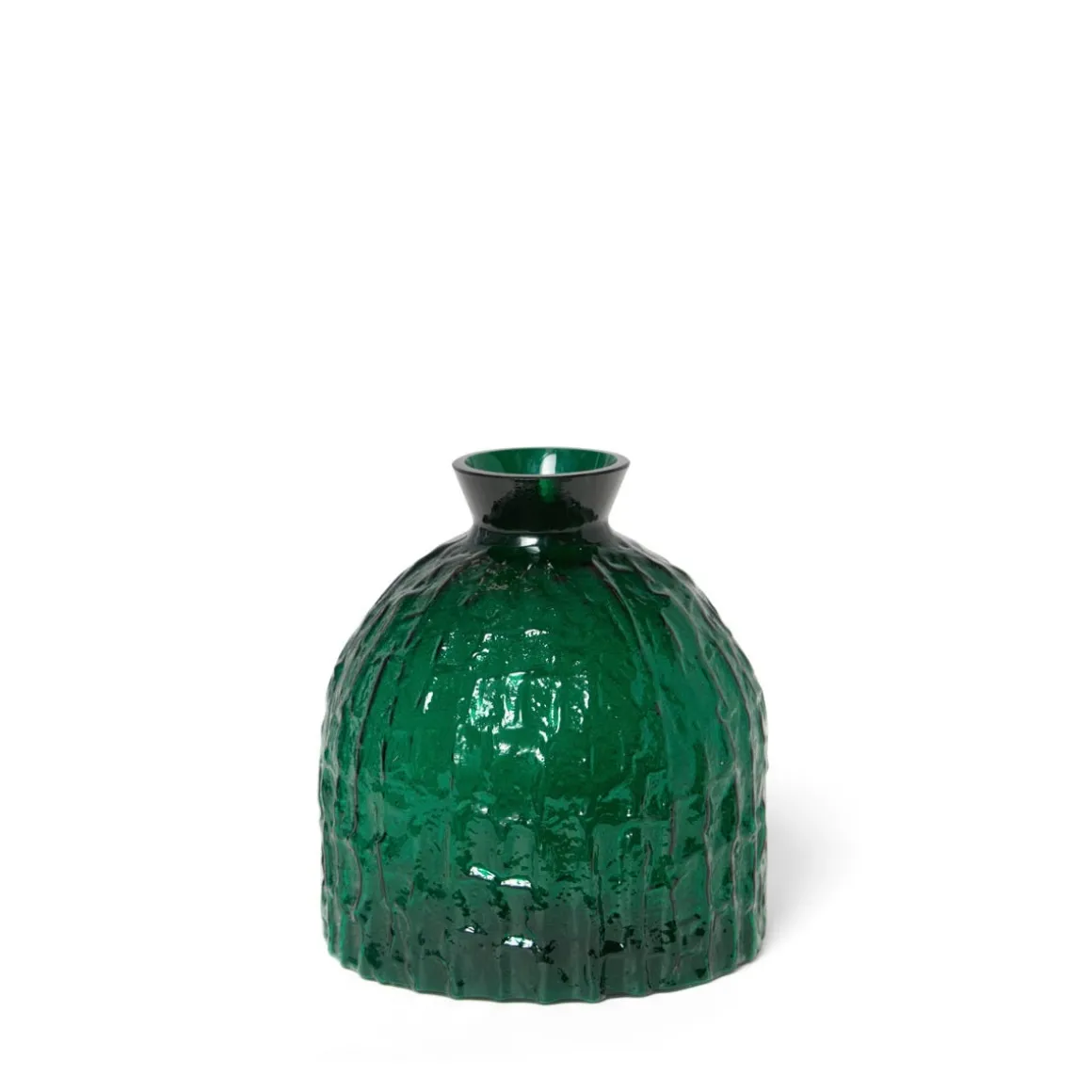 Munblåst mindre vas i klarglas, framtagen i samarbete med Skrufs Glasbruk i Småland. Varje vas är munblåst med precision och fingertoppskänsla av Skrufs skickliga glasblåsare. Vasens struktur ger glaset liv och karaktär och skapar ett unikt ljusspel som framhäver hantverket bakom varje exemplar. Lika fin med snittblommor i och som en dekorativ inredningsdetalj i sig. Finns även i klarglas och orange.