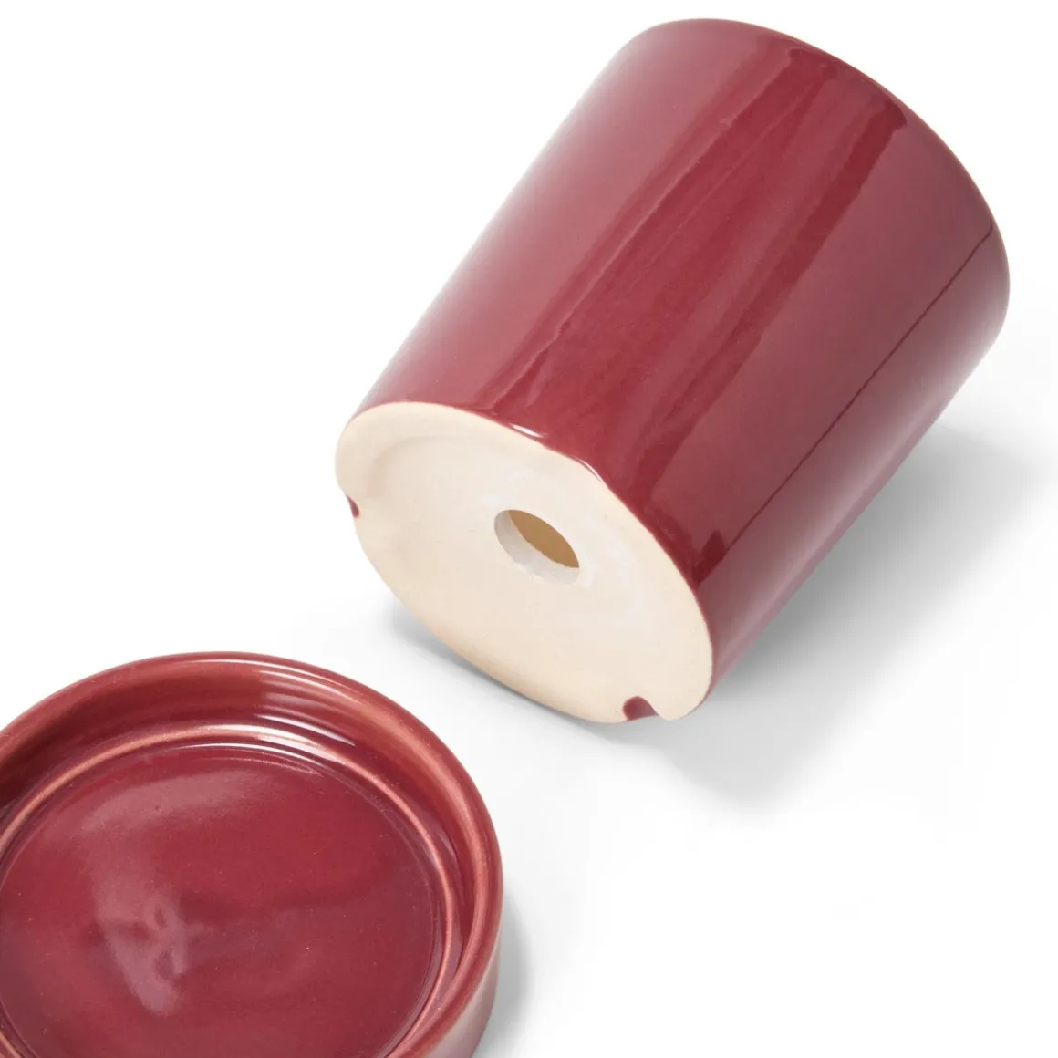 Mindre mörkröd kruka i stengods med tillhörande fat, perfekt för exempelvis färska kryddor på köksbänken. Krukan har ett dräneringshål och kan användas både ute och inne. Fin att ha flera ihop eller på egen hand. Matcha den gärna med blomkrukan i samma färg eller krukorna i samma serie i andra färger.