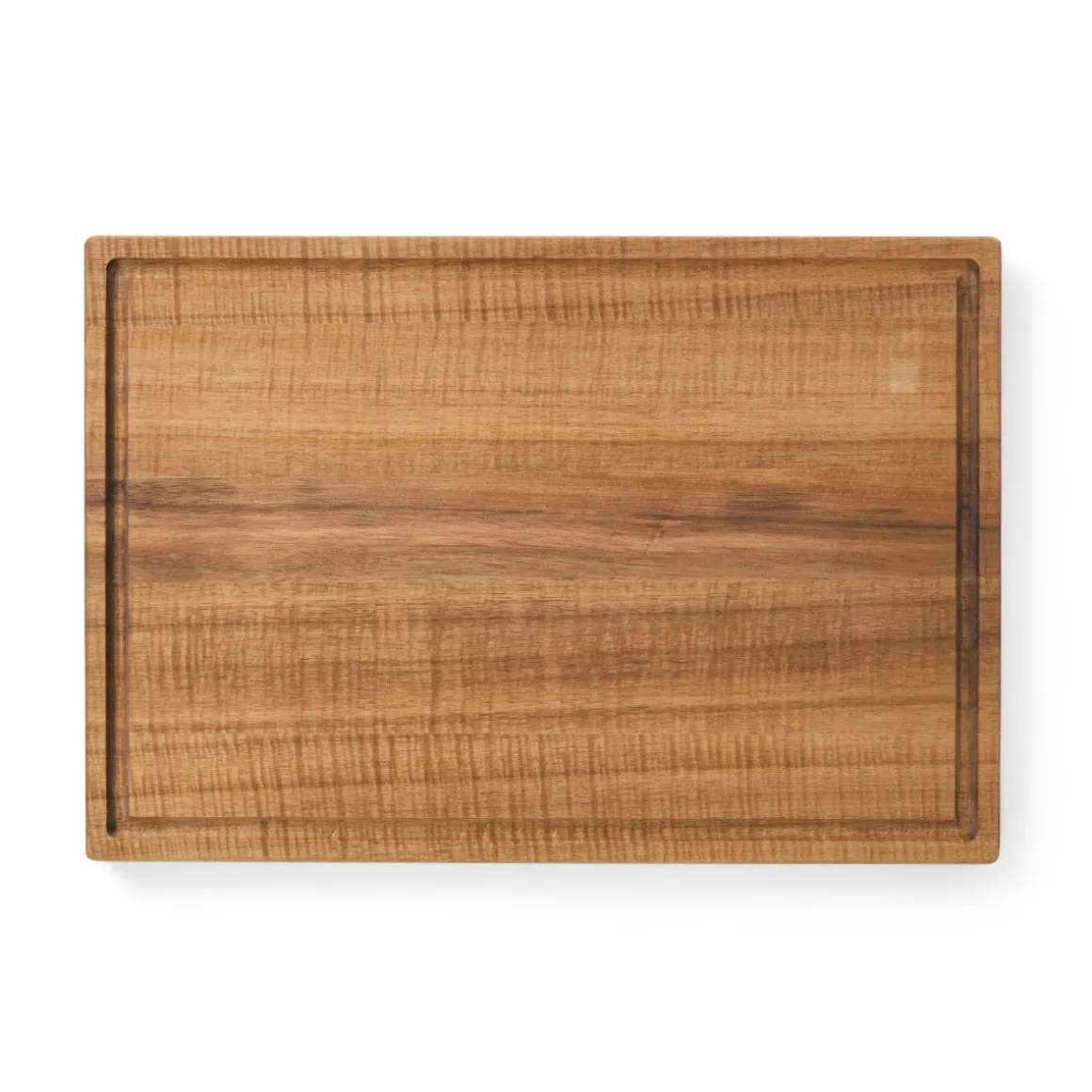 Trancherbräda i FSC-certifierad akacia, behandlad med ekologisk ricinolja. En skärbräda med en försänkt fåra för avrinning som är lika perfekt för både matlagning och servering.